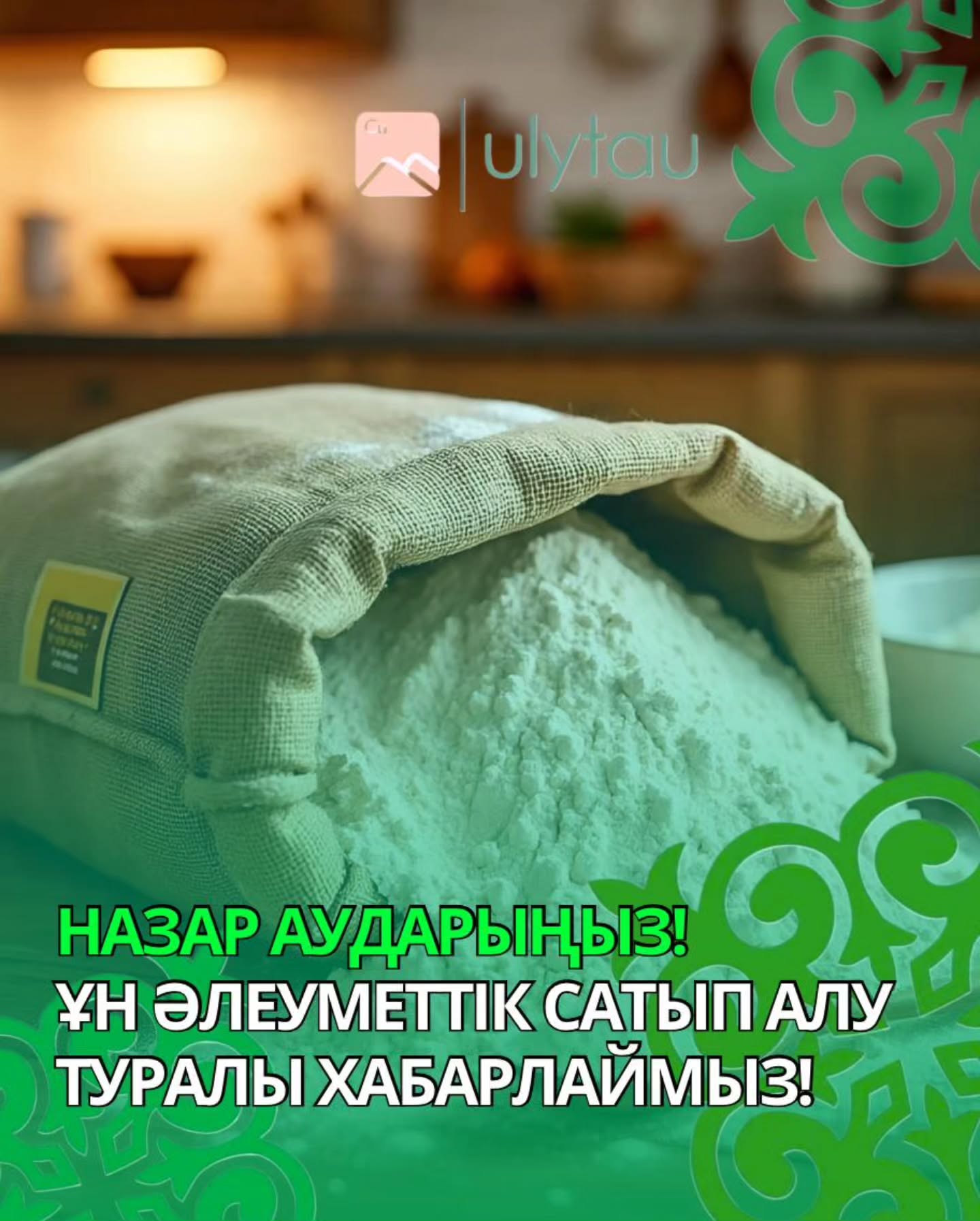 Әлеуметтік маңызы бар азық-түлік тауарларының бағасын тұрақтандыру мақсатында «Ұлытау» ӘКК» АҚ 840 тонна ұнды (50 кг-дық қаптарда) қоймада сақтау және тұрақты түрде жаңарту шартымен әлеуметтік сатып алуды жариялайды.