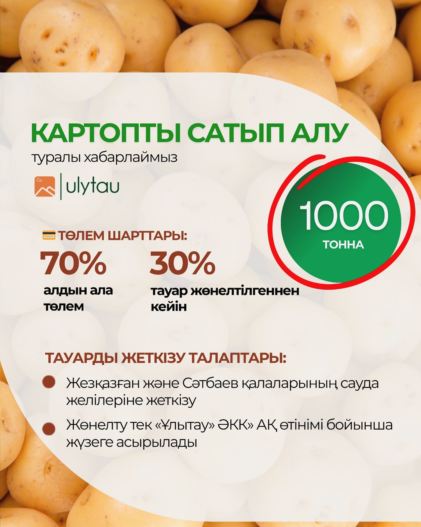 Әлеуметтік маңызы бар азық-түлік тауарларының бағасын тұрақтандыру аясында «Ұлытау» ӘКК» АҚ 1000 тонна көлемінде картопты сатып алуды жариялайды.