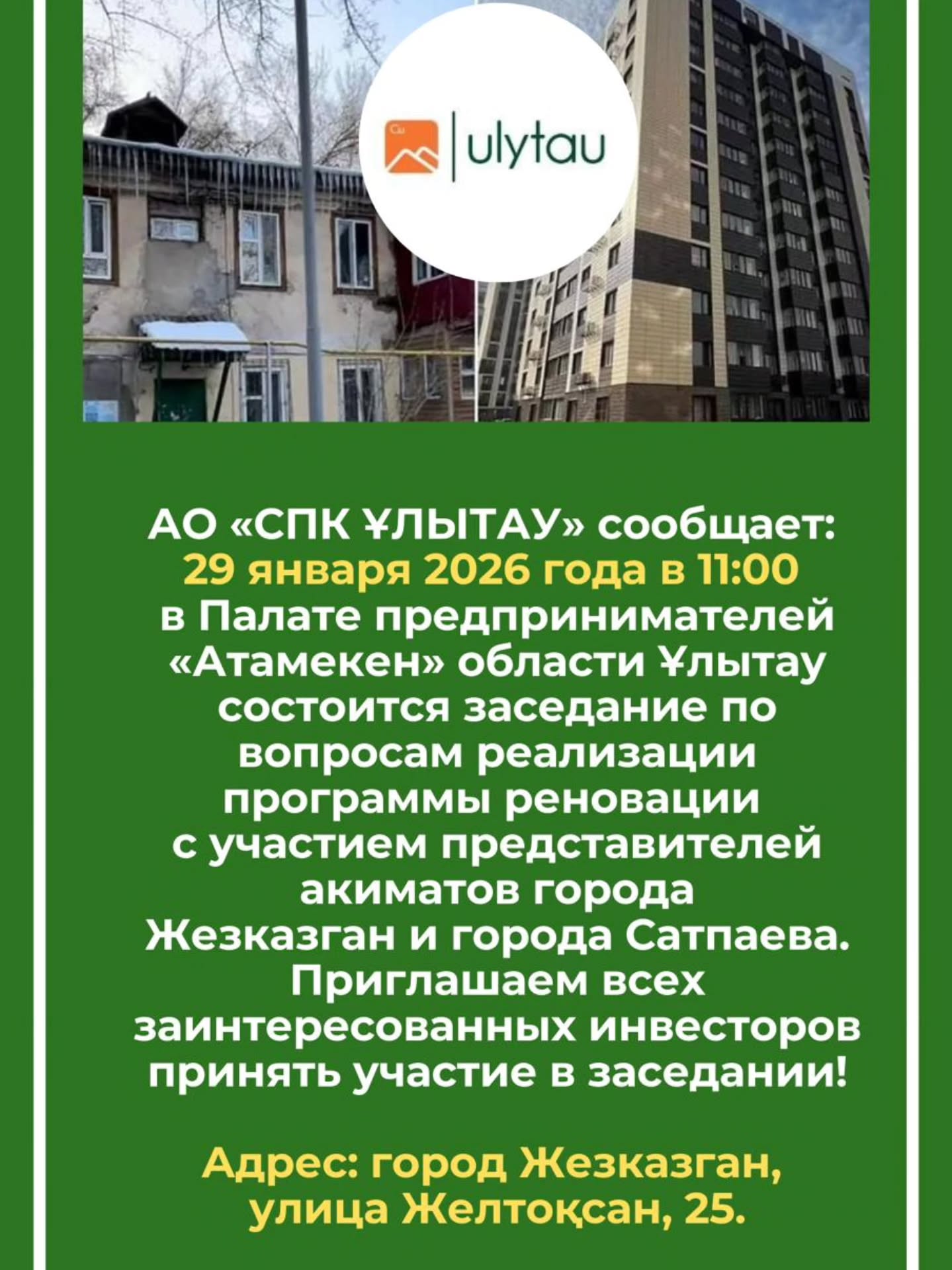 📣📣📣АО «СПК ҰЛЫТАУ» сообщает: 29 января 2026 года в 11:00 в Палате предпринимателей «Атамекен» области Ұлытау состоится заседание по вопросам реализации программы реновации с участием представителей акиматов города Жезказган и города Сатпаева.
