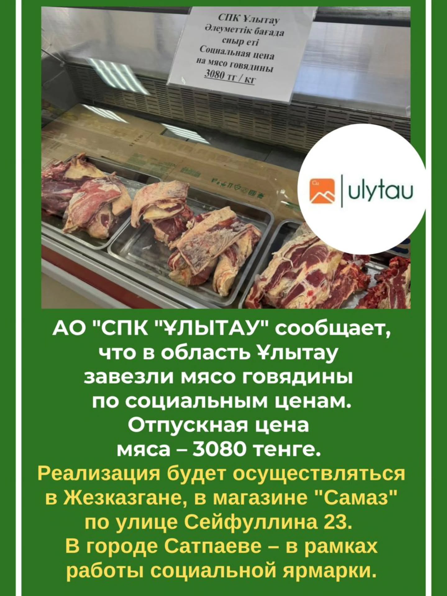 📣📣📣АО » СПК » ҰЛЫТАУ» сообщает, что в область Ұлытау завезли мясо говядины по социальным ценам.
