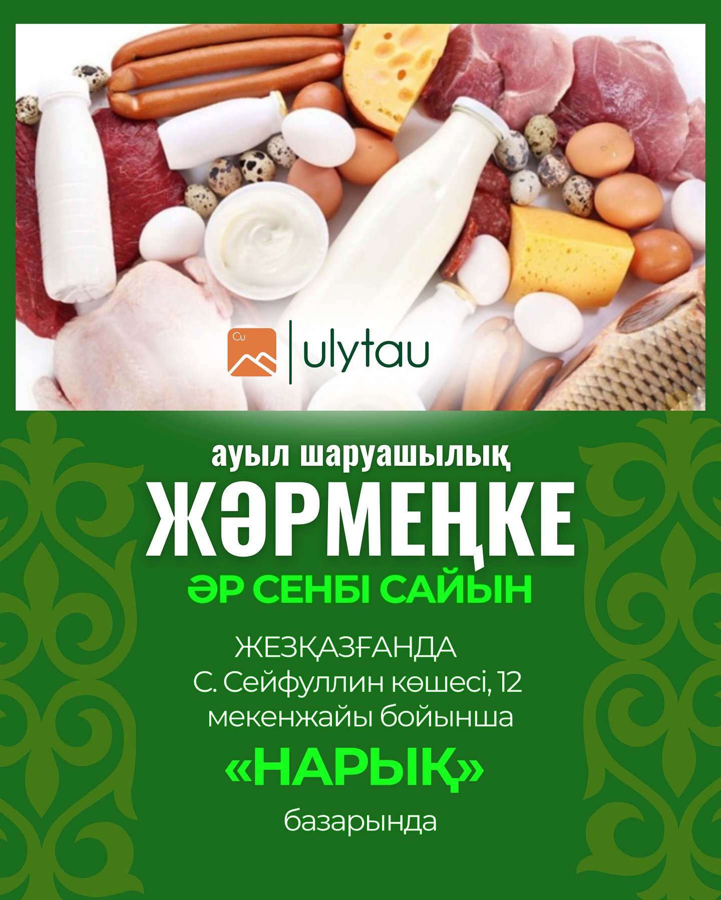🎪 Әр сенбі сайын Жезқазған қаласында С. Сейфуллин көшесі, 12 мекенжайы бойынша «Нарық» базарында ауыл шаруашылық жәрмеңкелер өткізіледі