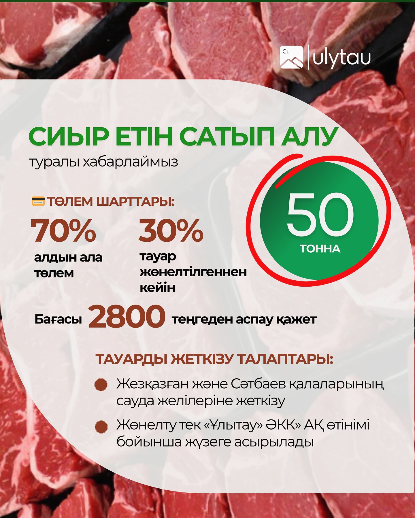 Әлеуметтік маңызы бар азық-түлік тауарларының бағасын тұрақтандыру аясында «Ұлытау» ӘКК» АҚ 50 тонна көлемінде сиыр етін сатып алуды жариялайды, бір килограмм өнімнің бағасы 2800 теңгеден аспау қажет.