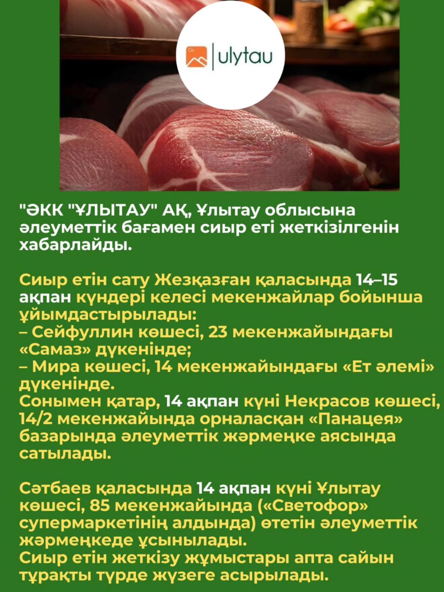📣📣📣АО » СПК » ҰЛЫТАУ» сообщает, что в область Ұлытау поступило мясо говядины по социальным ценам.